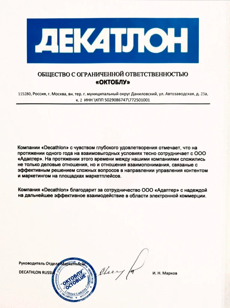 Команда Decathlon с большим удовольствием отмечает плодотворное сотрудничество с ООО «Адаптер». За год совместной работы между нами сложились не просто деловые, а по-настоящему партнерские отношения, основанные на взаимопонимании. Мы ценим эффективное решение сложных вопросов в управлении контентом и маркетингом на маркетплейсах и благодарим команду «Адаптер» за надежное сотрудничество. Надеемся на дальнейшее взаимодействие в области электронной коммерции.