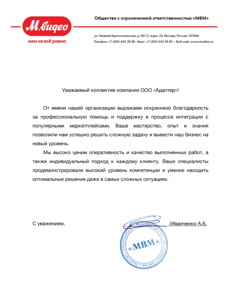 От имени «М.Видео» выражаем искреннюю благодарность компании «Адаптер» за профессиональную помощь и поддержку в процессе интеграции с популярными маркетплейсами. Ваше мастерство, опыт и знания позволили нам успешно решить сложную задачу и вывести наш бизнес на новый уровень.