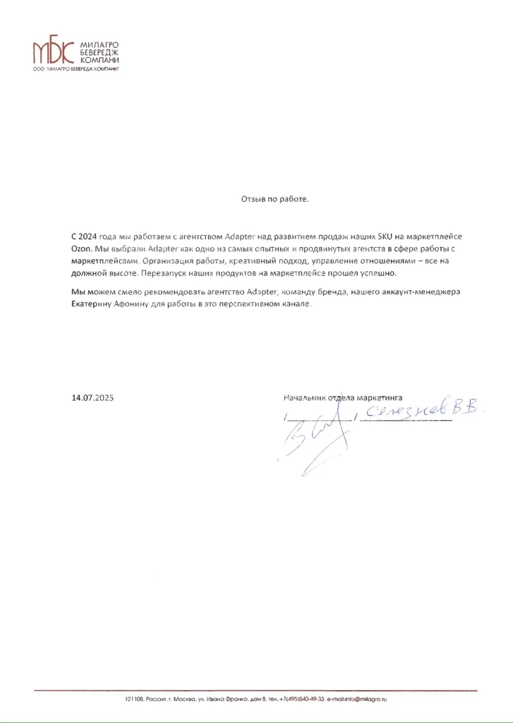Наша компания «МИЛАГРО БЕВЕРЕДЖ КОМПАНИ» сотрудничает с агентством Adapter с начала 2024 года для развития продаж на Ozon. Мы искали опытного партнера и остановили свой выбор на Adapter, отметив их экспертизу в работе с маркетплейсами.