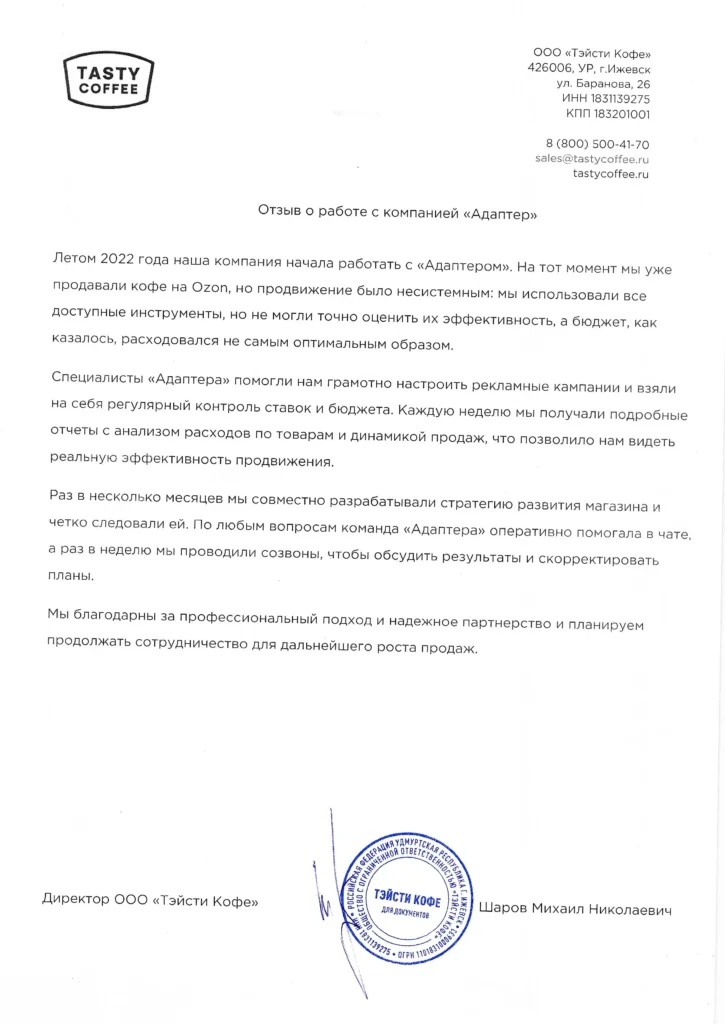 С лета 2022 года наша компания работает с «Адаптером». На тот момент продвижение кофе на Ozon было несистемным, и бюджет расходовался неоптимально. Специалисты «Адаптера» помогли нам грамотно настроить рекламные кампании, взяли на себя контроль ставок и бюджета. Каждую неделю мы получаем подробные отчеты с анализом расходов и динамики продаж, что позволяет видеть реальную эффективность продвижения.