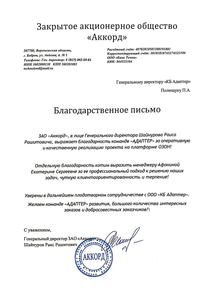 ЗАО «Аккорд» выражает благодарность команде «АДАПТЕР» за оперативную и качественную реализацию нашего проекта на платформе ОЗОН. Всё было сделано на высоком уровне!